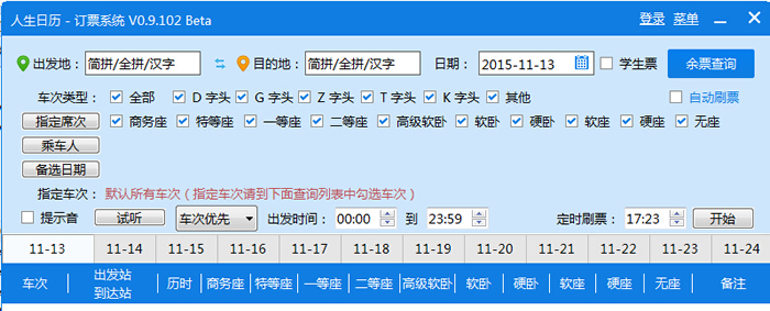 软件简介: 人生日历抢票软件是“人生日历”中的一款应用,实现火车票自动抢票,操作比较简单。 软件类型:电脑客户端/手机客户端、免费软件 下载地址:http://rili.160.com/ 注意:软件版权归开发者所有,软件风险由网民自行甄别,由于使用软件而带来的一切问题与本站无关。 使用方法: 下载人生日历软件后,点击“应用”,找到“订火车票”的图标,点击载入后即可使用。 ![]() ![]() |