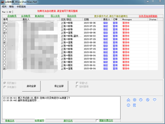 软件简介: 山鸟抢票是一款收费抢票软件,包括电脑客户端和手机客户端。山鸟抢票可以实现多用户多线程抢票,自动识别验证码,智能变换CDN服务器等功能。 软件类型:电脑客户端/手机客户端、收费软件 下载地址:http://www.shanniao.net 注意:该软件需要向开发者捐款并获得注册码后才能使用,具体请查看其官网说明。软件版权归开发者所有,软件风险由网民自行甄别,由于使用软件而带来的一切问题与本站无关。 使用方法: 可以参考其官网的说明(包括软件的安装、使用和常见问题)。 ![]() |